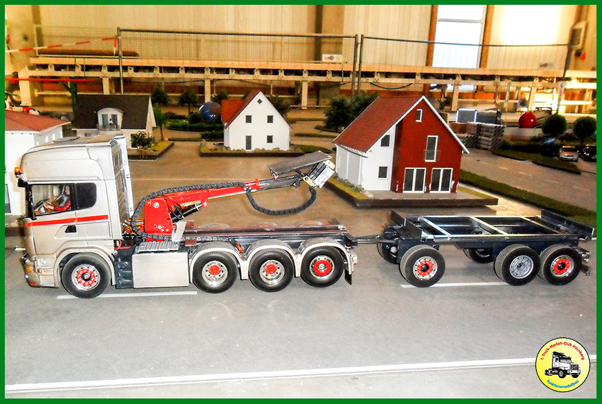 Ich bin seit einigen Jahren Truckmodellbauer. Eines Tages hatte ich die Idee solch ein Modell zu bauen, da ich dieses Fahrzeug noch nie als Modell gesehen hatte. Bei Recherchen im Internet bin ich auf die Achskombination 8 x 4 / 4 gekommen, erst wollte ich meine 4-Achs Zugmaschine von Wedico umbauen. Doch dann hatte ich die Chance, eine 3-Achs Zugmaschine von Scania mit viel Zubehör zu erwerben.