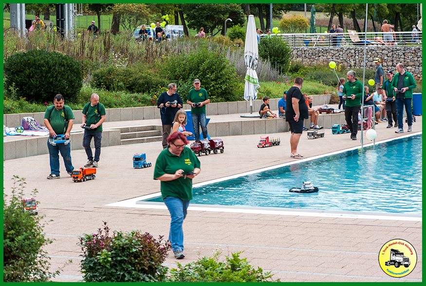 Neustadt a. d. Aisch - Das Waldbad in Neustadt a. d. Aisch lockte seine Gäste zum Saisonabschluss noch einmal mit zusätzlichen Attraktionen. Unsere Kollegen vom Schiffsmodellbauclub Nürnberg e.V. haben der Termin klargemacht und wir haben unseren Vereinssonntag im September kurzerhand ins Freibad verlegt. So konnten wir den buchstäblich letzten Tag des Sommers gemeinsam verbringen und haben festgestellt, dass die Grenzen beider Vereine fließend sind. Denn so mancher maritime Kapitän hatte seinen Truck dabei und einige Kapitäne der Landstraße kramten ihre Schiffe hervor. Ein gelungener Nachmittag!